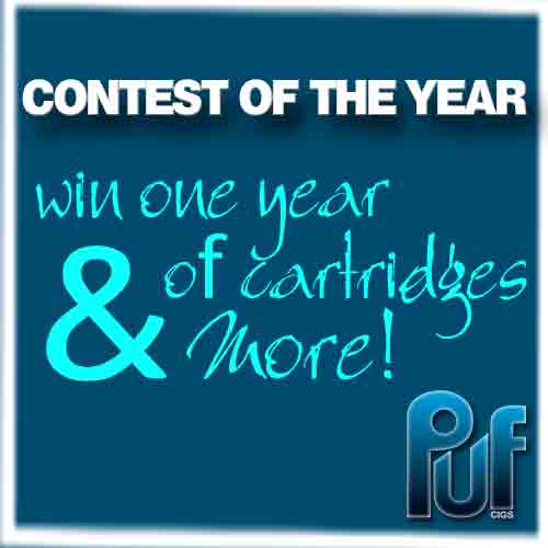 Enter to win a year's worth of rechargeable Puf Cigs cartridges (180 cartridges of your choice, 12 rechargeable batteries) by submitting a photo of you. Photo should be of you using your E- Cig in a cool, fun or crazy place. Once the photo is submitted and uploaded, the public will then have a chance to vote. Terms and conditions apply. Good luck!